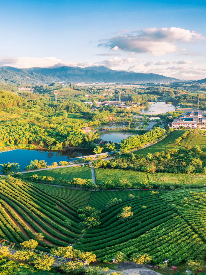 景区内茶山连绵起伏,水流环绕,空气清新宜人。