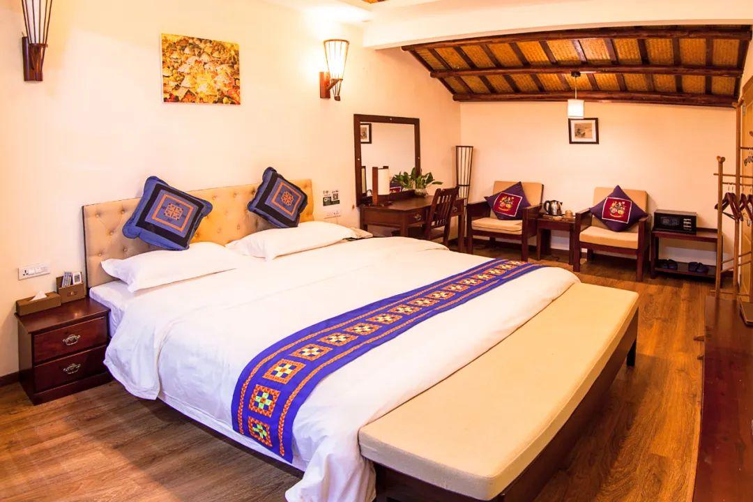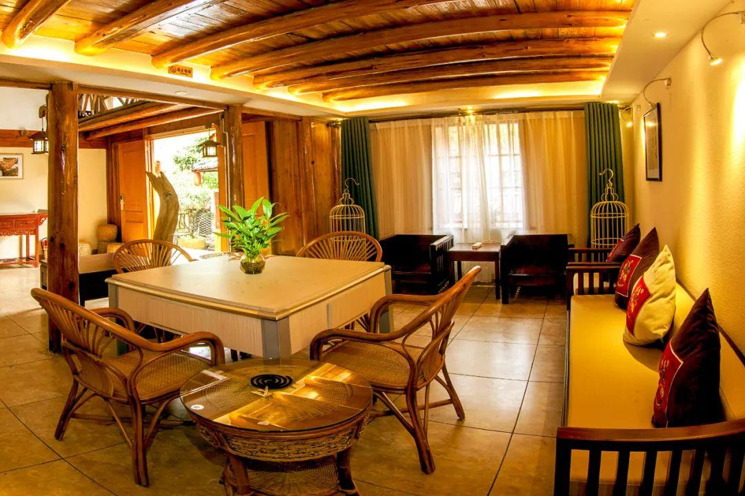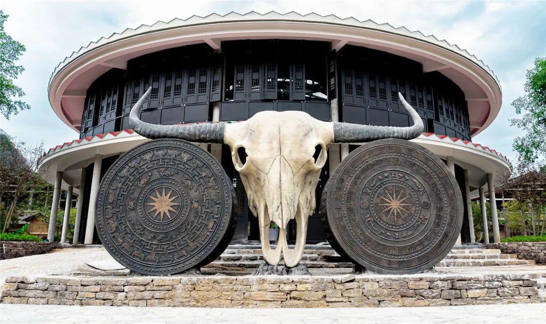 其内部功能完善,瑶王印、铜鼓、牛角、鸟笼等白裤瑶族的文化元素有机融入客房装饰之中,既有民族风情,又有江南庭院院景。