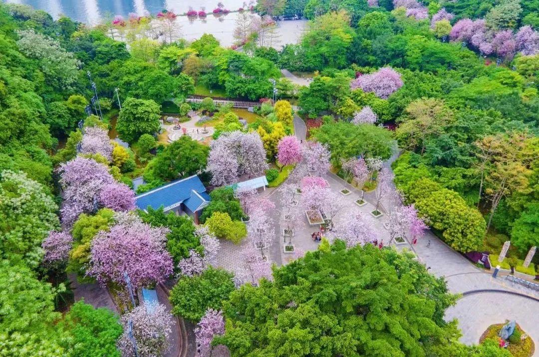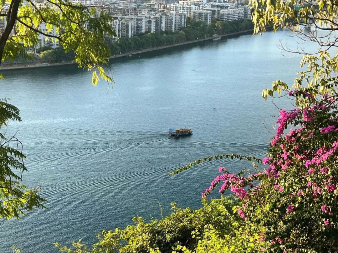 靠近窑埠古镇的蟠龙山公园,紫荆花和绿植交相辉映,在山上可以将整座城市的烟火气尽收眼底。