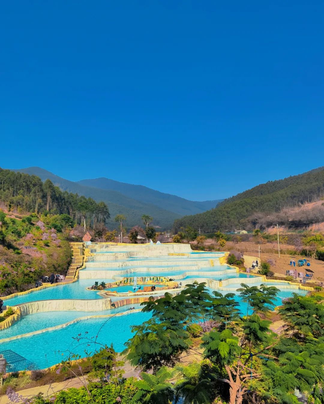 这里的温泉水富含多种矿物质,其水体通透,是国内少见的蓝色温泉,被称为“中国蓝泉”。