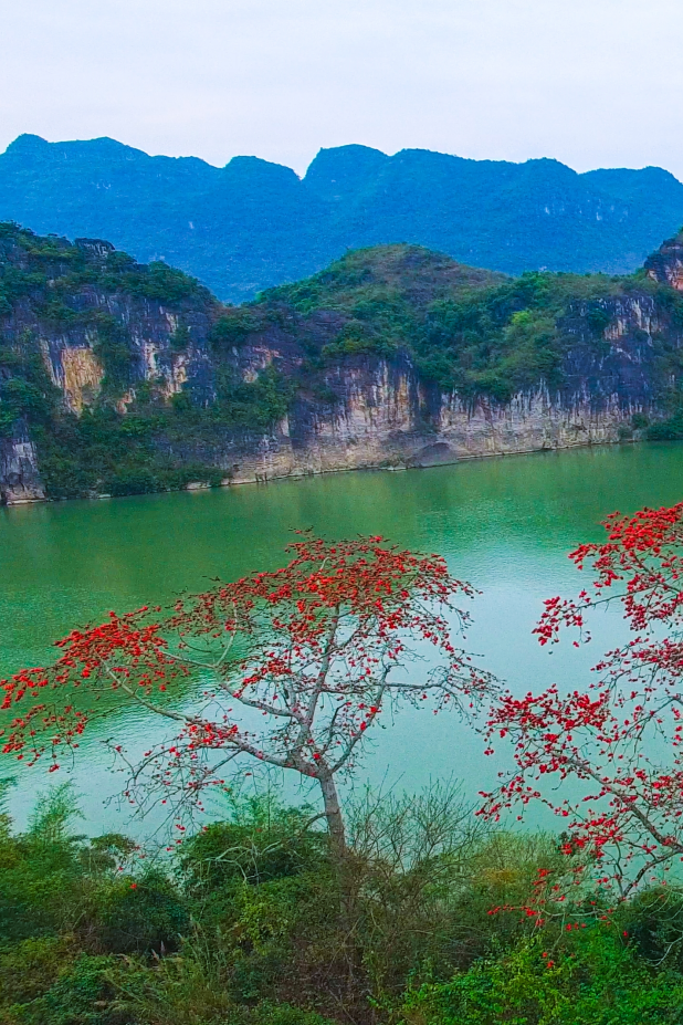 大自然的鬼斧神工打磨出这片石岩景观,与鲜艳的木棉花共同点缀着左江两岸的景色。