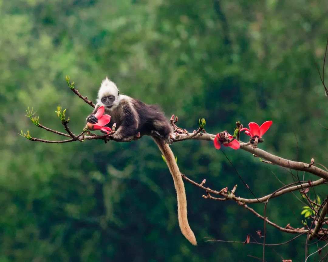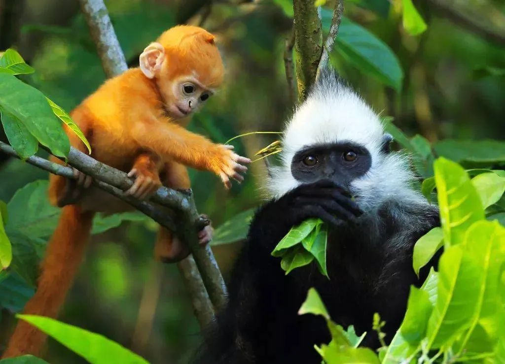 在广西崇左白头叶猴国家自然保护区,你可以从树叶间隙中窥见俏皮的白头叶猴欢快地吃着嫩叶。