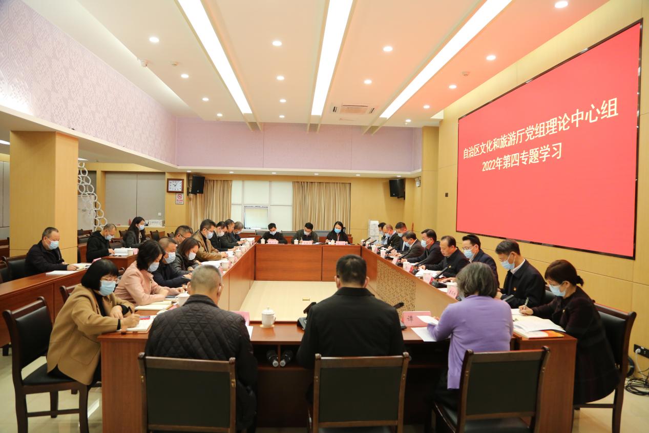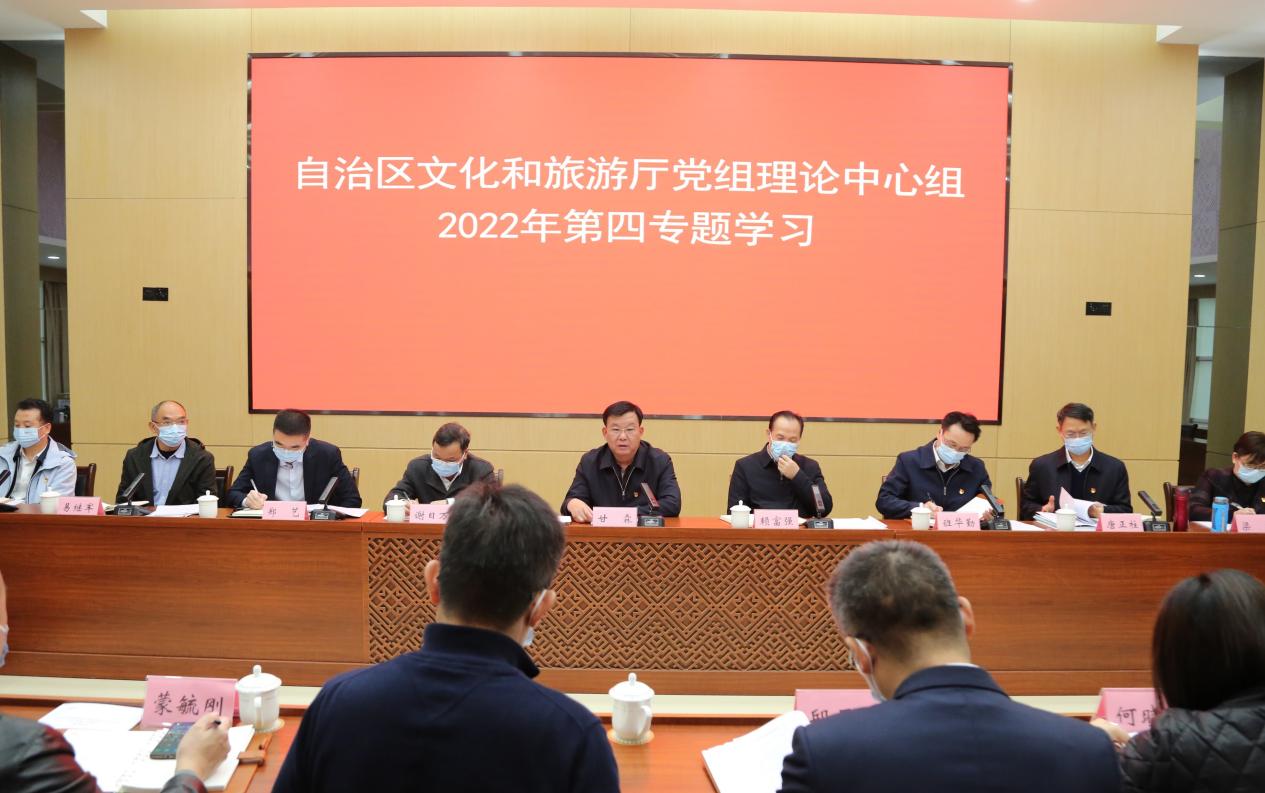 12月8日上午,自治区文化和旅游厅党组理论学习中心组以“深入学习宣传贯彻党的二十大精神,奋力开创新时代壮美广西建设新局面”为主题,开展了2022年第四专题学习。厅党组书记、厅长甘霖主持会议。