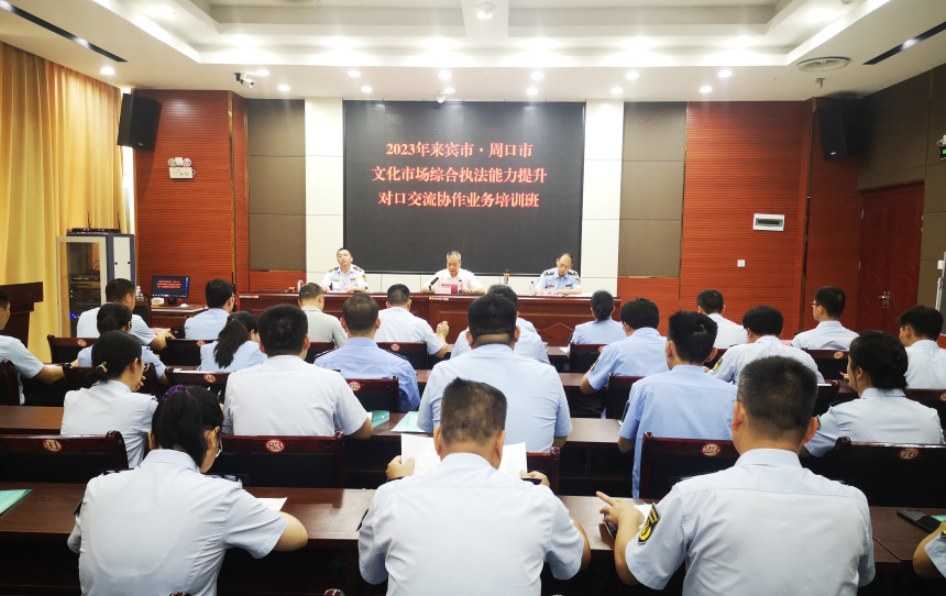 6月7日至9日, 2023年广西来宾市·河南周口市文化市场综合执法能力提升对口交流协作培训班在来宾市博物馆举办。来自河南省周口市、县文化市场综合行政执法领导专家,广西来宾市、县(市)文化市场综合行政执法骨干等近50人参加培训。