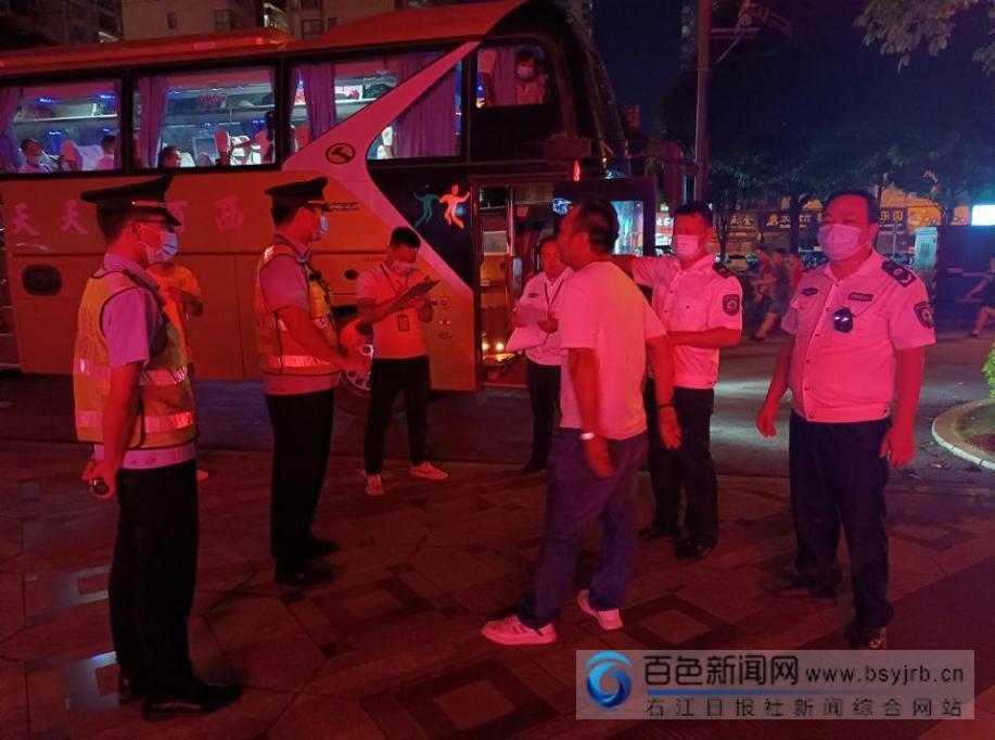 “您好,请下车配合我们检查。”7月10日晚21时,百色市文化市场综合行政执法支队与市公安局右江分局、右江区交通运输综合执法队在百色高速路口开展联合执法检查中,发现一辆旅游大巴车上载着55名乘客,执法人员通过核查,发现该旅行团组织者曾某涉嫌未取得旅行社业务经营许可证的情况下,擅自开展“百色—北海二日一晚旅游”业务。执法人员立即要求该旅游车辆到指定地点,对组织者、司机、游客分别做调查取证工作。