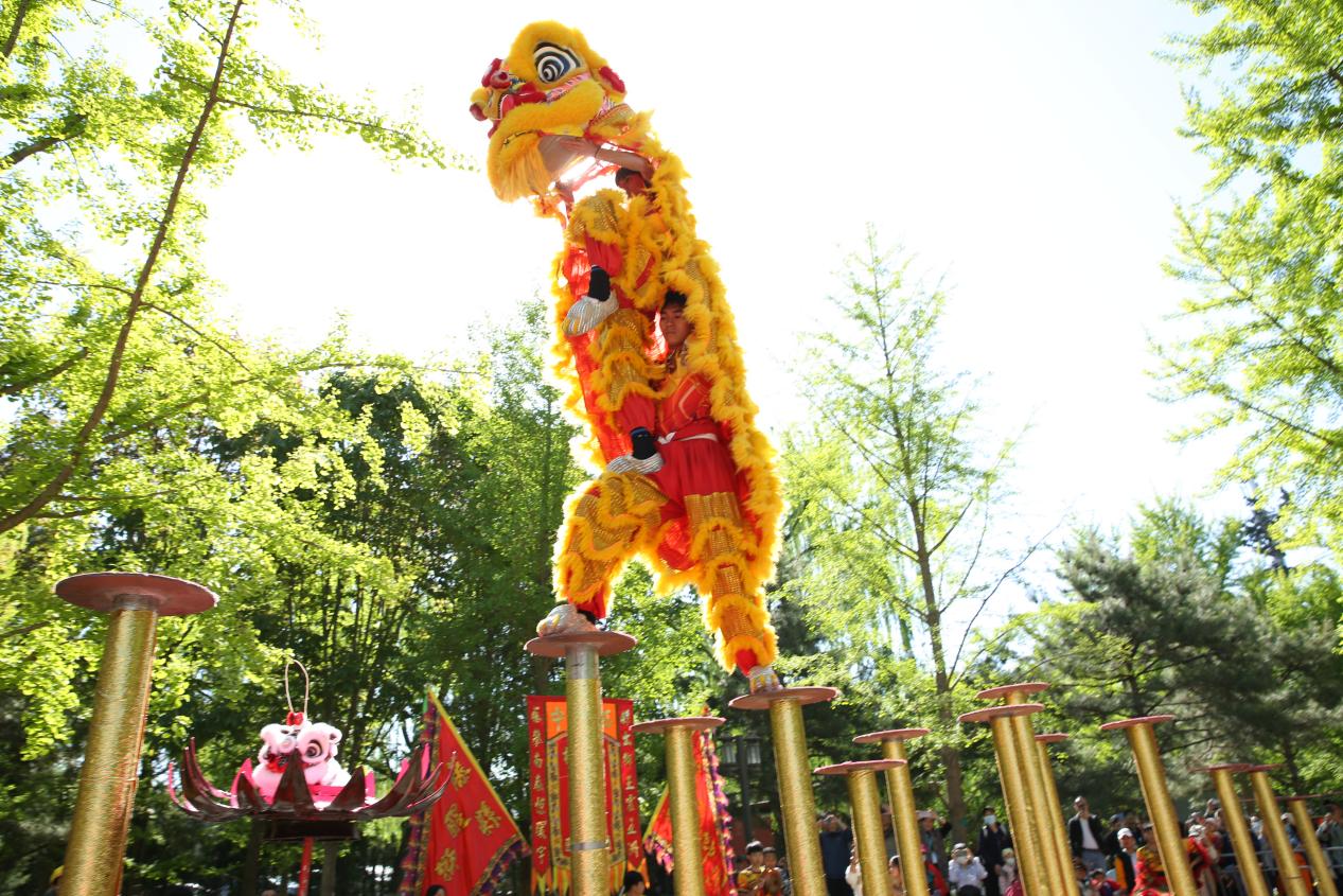 “咚咚隆锵,咚咚隆锵……”周日的北京地坛公园北门处锣鼓阵阵、人气十足,伴随着强劲的鼓点,来自梧州藤县的醒狮在高低错落的梅花桩上攀高跳跃、腾转挪移,以技术和美感俱佳的狮舞喜迎各地宾朋共赏广西非遗艺术展演,赢得现场掌声、喝彩声不断。