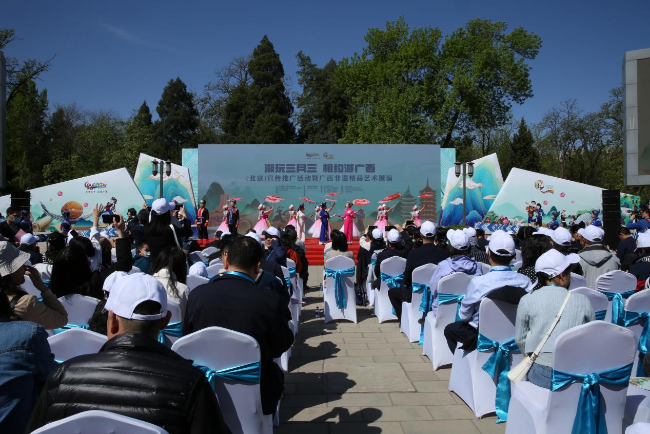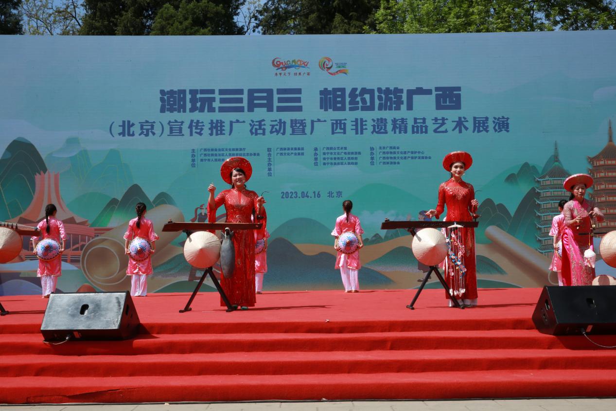 4月16日,自治区文化和旅游厅联合自治区人民政府驻北京办事处、南宁市人民政府在北京市地坛公园举办2023年“潮玩三月三 相约游广西”(北京)宣传推广活动暨广西非遗精品艺术展演,诚邀广大游客来广西赏八桂美景、庆民族佳节。