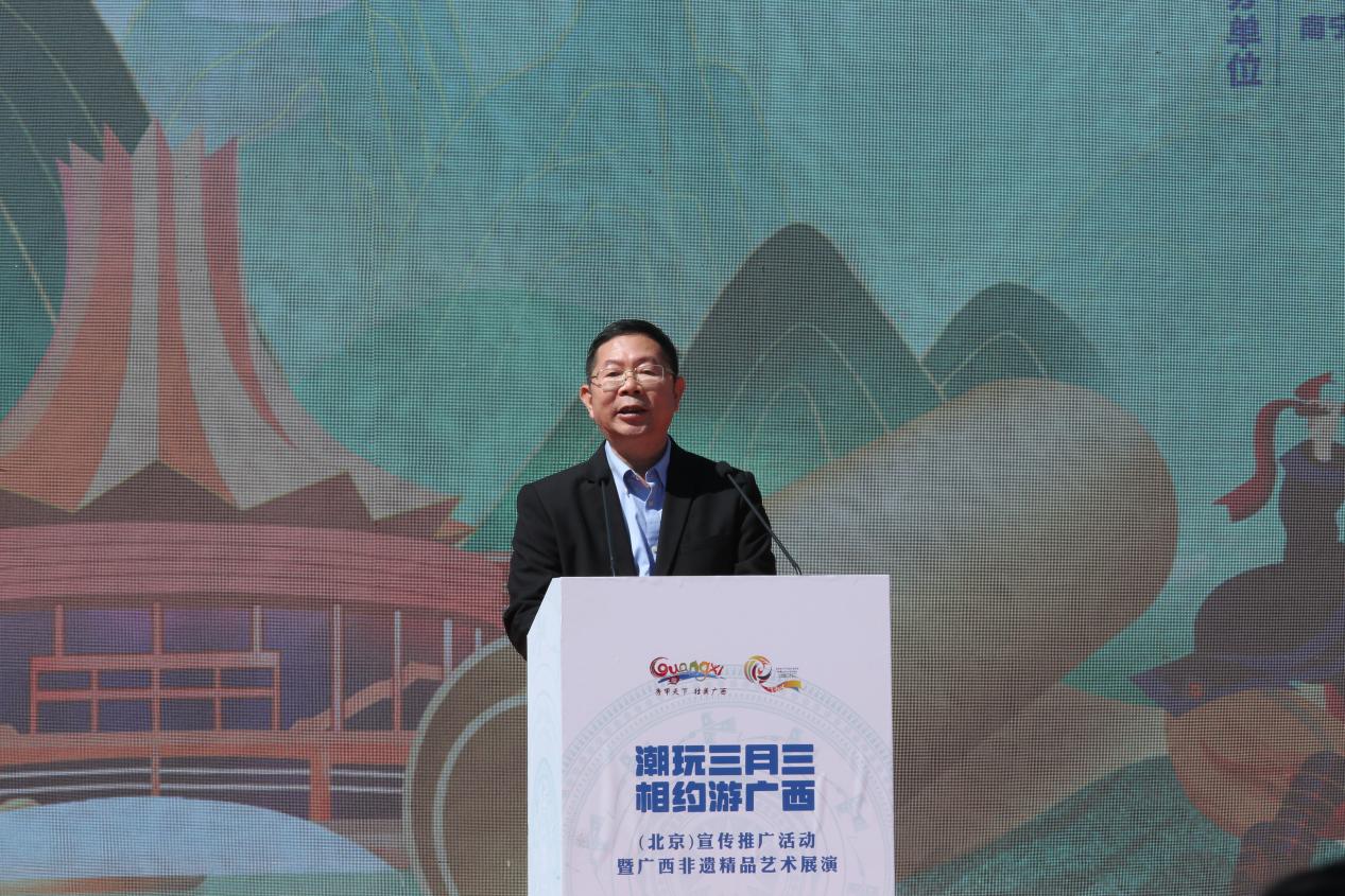 欧余军在致辞中表示,今年“三月三”,全区14个市文化和旅游行政管理部门重点突出“传统与新潮”融合,走出去与请进来结合,将举办“壮美霓裳”广西—东盟民族服饰秀、中国—东盟非物质文化遗产周、“欢度三月三 八桂新交响”(北京)交响音乐会、柳州“鱼峰歌圩”全国山歌邀请赛等上百场次民族特色浓郁的文化旅游活动,届时邀约越南、泰国、缅甸等东盟国家以及国内多个省区的文化项目来广西交流、展示,让国内外游客领略广西的文化之美、民族之美、生活之美,持续提升“三月三”广西民族文化节庆品牌的国际影响力。