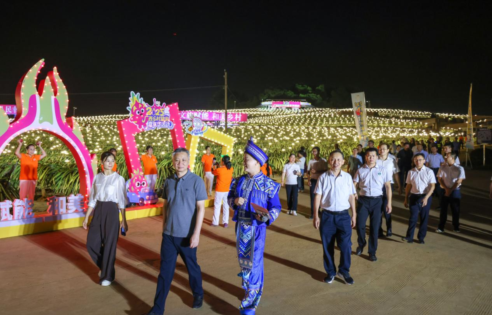 9月22日晚7时,2025广西乡村旅游嘉年华在广西南宁市隆安县金穗万亩火龙果示范基地拉开帷幕。自治区文化和旅游厅党组成员、副厅长黄耀林,自治区农业农村厅二级巡视员杨天锦,自治区商务厅二级巡视员曹柯笛,南宁市人民政府副秘书长邝涤等领导和嘉宾共800余人出席活动。