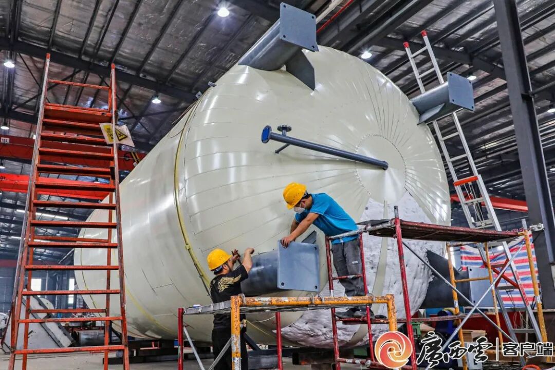 桂林市灵川县一家化工设备生产企业,工人正忙碌作业。阳海翔 摄