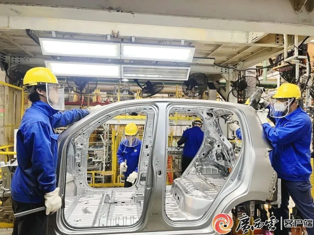 上汽通用五菱生产车间,工人正安装、检查汽车外框架。上汽通用五菱供图